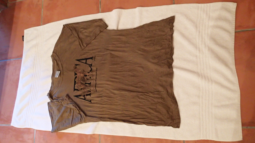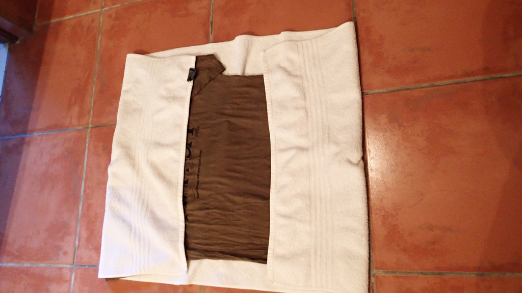 At this point, many people will just wring out the items and hang them in the bathroom. The problem here is that the clothes can take two days or more to dry. The key is to wring them out as best as you can and then lay them out on a towel like this. (You can put as many items as you can fit on one towel in a single layer):