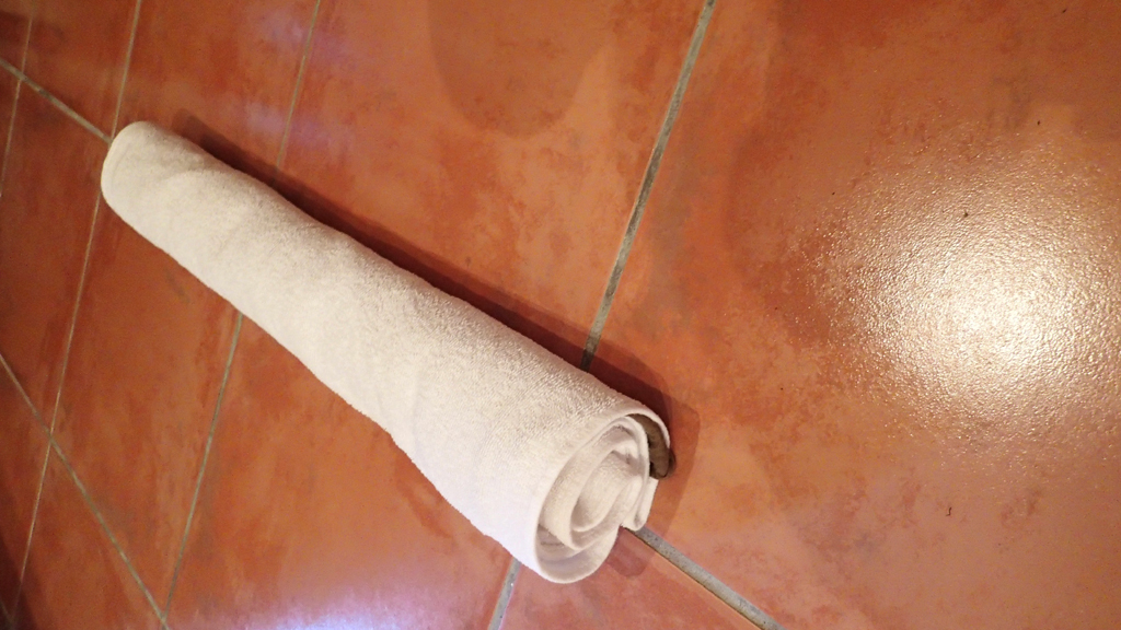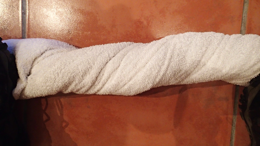 When I feel the towel has absorbed as much moisture as it’s going to get, I unroll it and hang it somewhere in the room where there is airflow like near an air conditioner, open window or in the hallway. If there’s heat, even better.