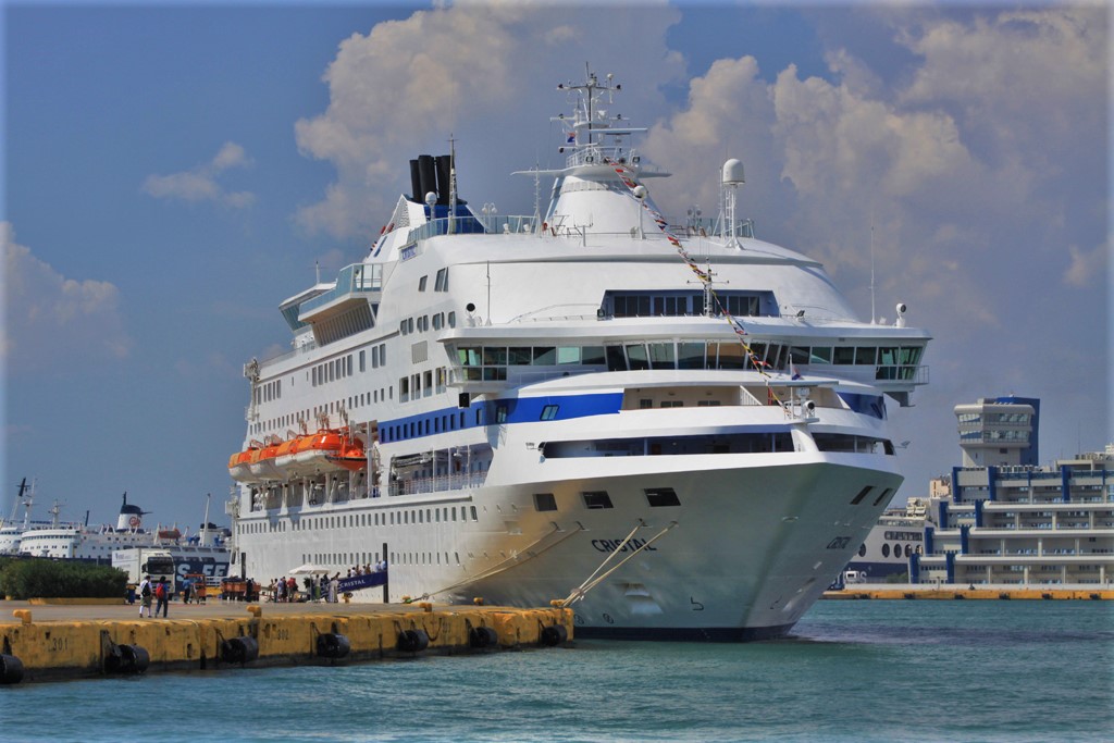 There was a duty free shop where you could pick up just about anything except a can of Coke. Outside the door, a woman waited with a sign for Cristal. You had a choice to wait for the bus or walk to the ship. We opted to walk.