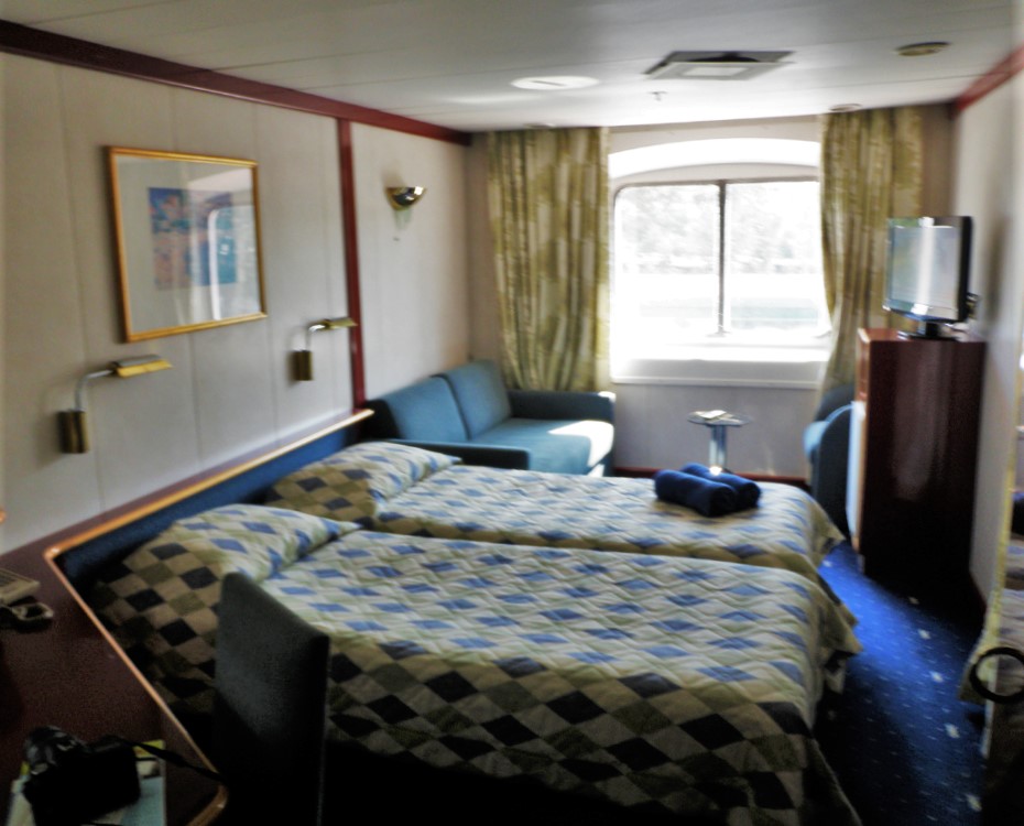 I got the Premier cabin. I think the biggest difference between this and the cabins on the lower decks was the size of the cabin. I had a sitting area next to my beds with a couch across from the TV. The other cabins didn’t have that extra few feet and some had smaller windows. Also, I had a glass enclosed shower with a barrier between the shower and the rest of the bathroom. The other cabins had only a shower curtain and no barrier, so the entire floor got wet. There was a safe in the room, but cost 15 Euro for the key for the week.The bathroom had shampoo.