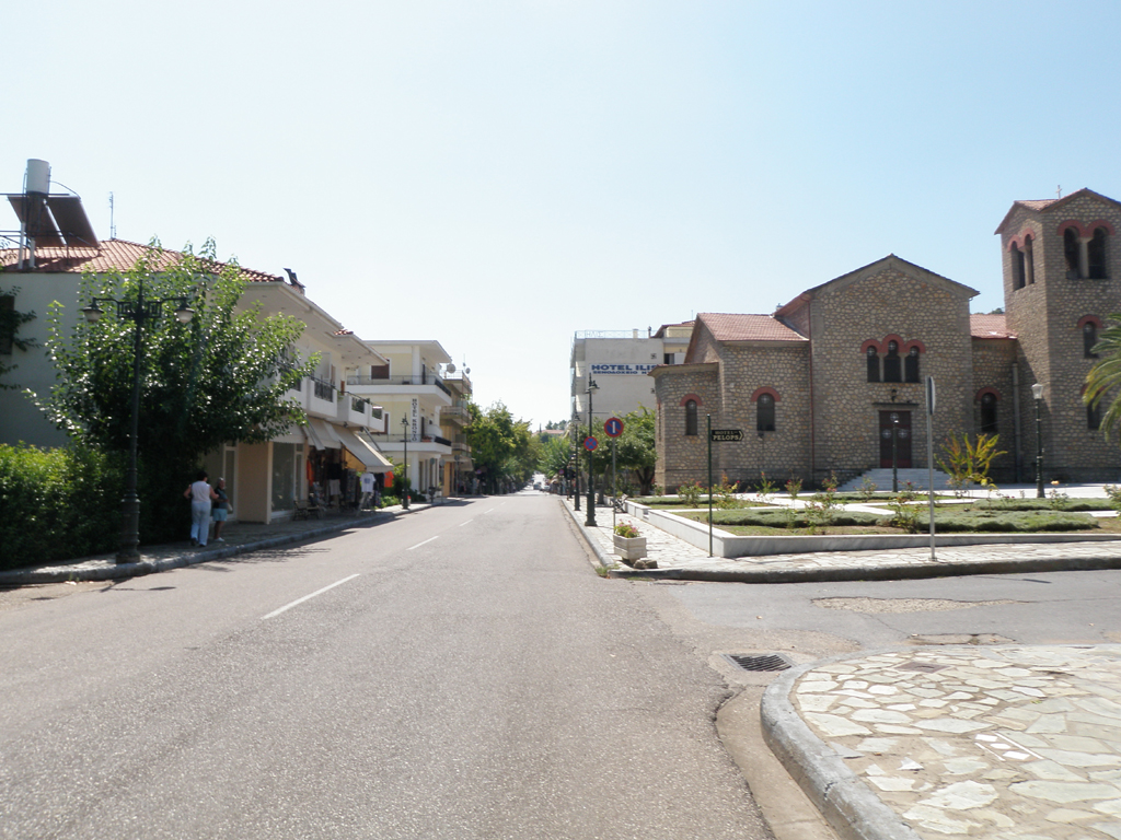 We stopped at a very sleepy town for our WC break. Nothing was open (siesta time) and we opted to walk around the empty square to stretch our legs. Another two hours and another switchback brought us down to the Ionian sea. We turned off the main road and drove for almost a half hour through back roads that seemed to lead to nowhere until we reached the tiny town of Olympia by 5:30. It was small and very tidy.