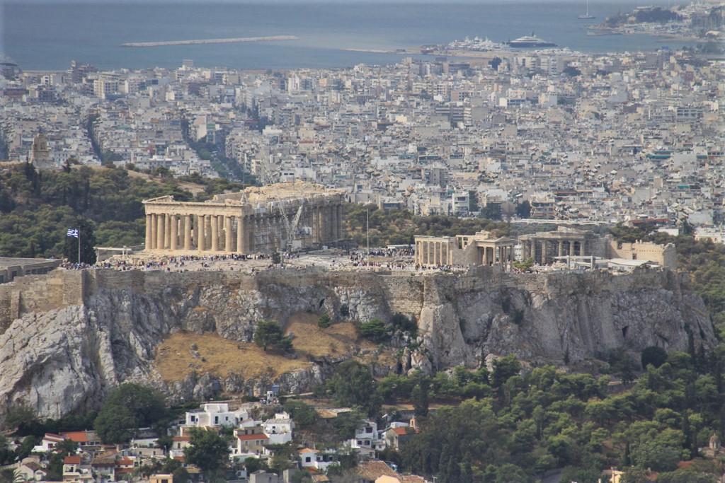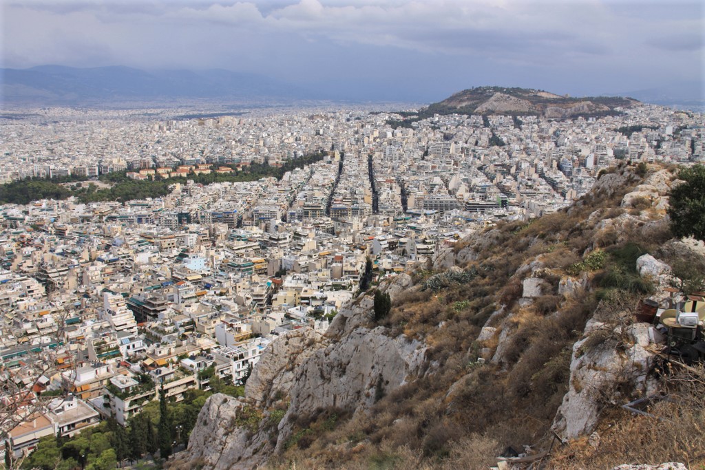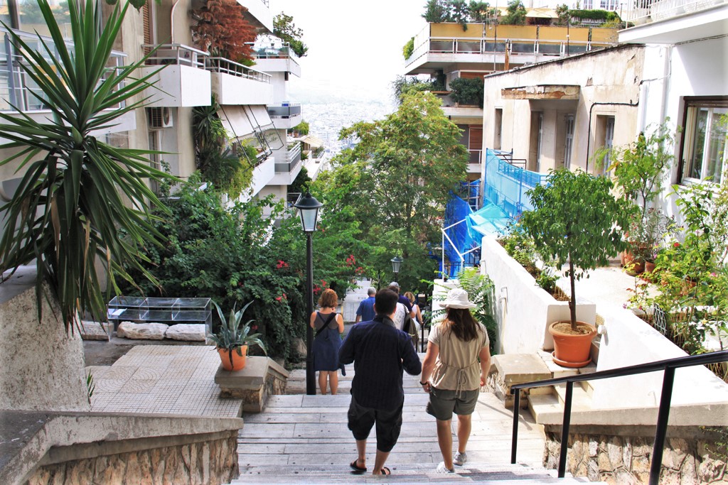 I put my camera into my knapsack and left just after nine for Lycabettus Hill. It wasn’t an excessively long walk, but if you have problems with walking, especially up hilly streets, take a taxi and ask the taxi to wait as you’d never see one up by the funicular. If you walk to the hill, take a map. The easiest way to get there is to walk to Syntagma Square (10 minutes) then turn east on Vass Sofias – a main street. Walk on the left side until you come to Ploutarhou. That street will take you straight to the funicular. The last portion of the street was stairs.