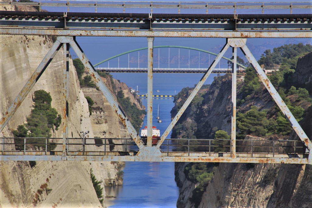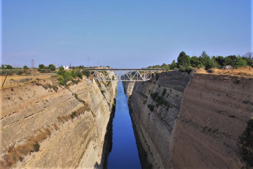 Luggage was out for 6:30 and I was down for breakfast shortly after. We boarded the bus and took the seats we would use for rotation which would be moving clockwise by four seats. The traffic out of Athens was quite light and we arrived at the Corinth Canal just after nine. The bus stopped at a store just fifty metres from the bridge over the canal.