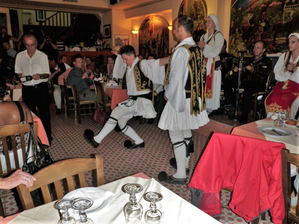 I had the chicken with roasted potatoes. Those who had the lamb loved it. It looked very tender. Dessert was a local specialty called baklava – a pastry with nuts that is immersed in honey. It was far too sweet and I wished I had opted for the ice cream. There was entertainment throughout the night including dancers (who would dance for us then disappear into a neighbouring taverna before returning to dance for us again).
