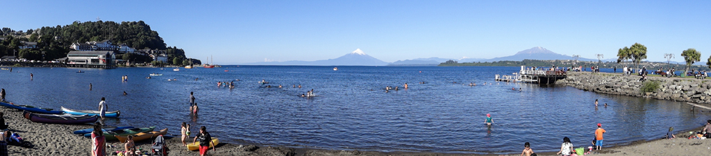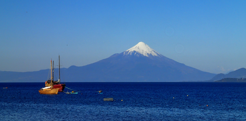 It was kinda surreal watching kids play and swim with a volcano just across the lake. A year later, Calbuco (the peak to the right of Osorno) erupted. The photo below was taken from a similar vantage point (photo courtesy Diego López and Wikimedia Commons).