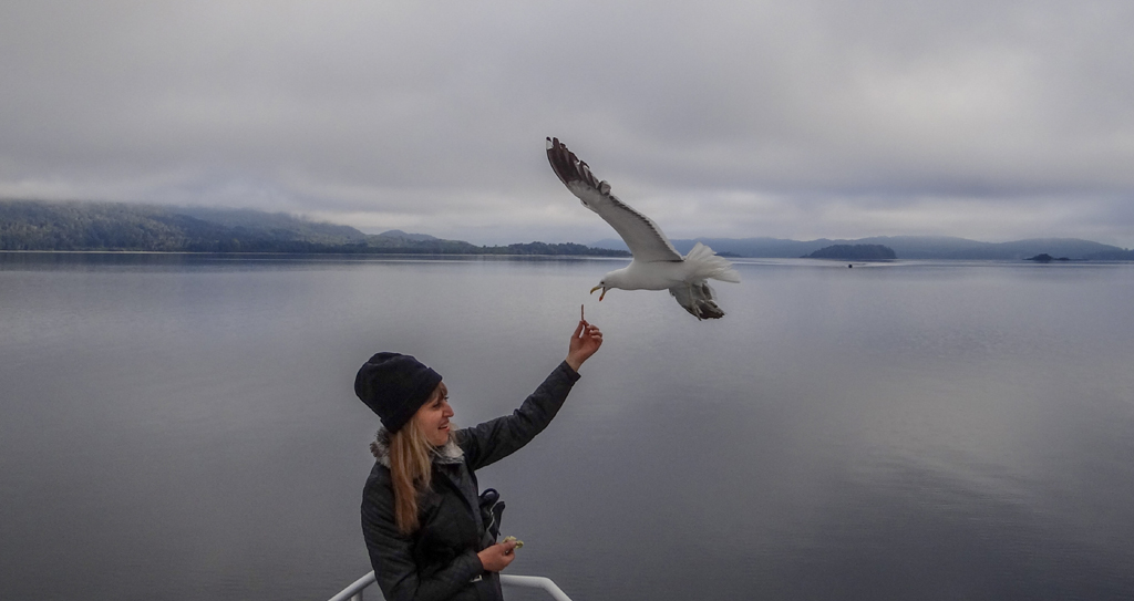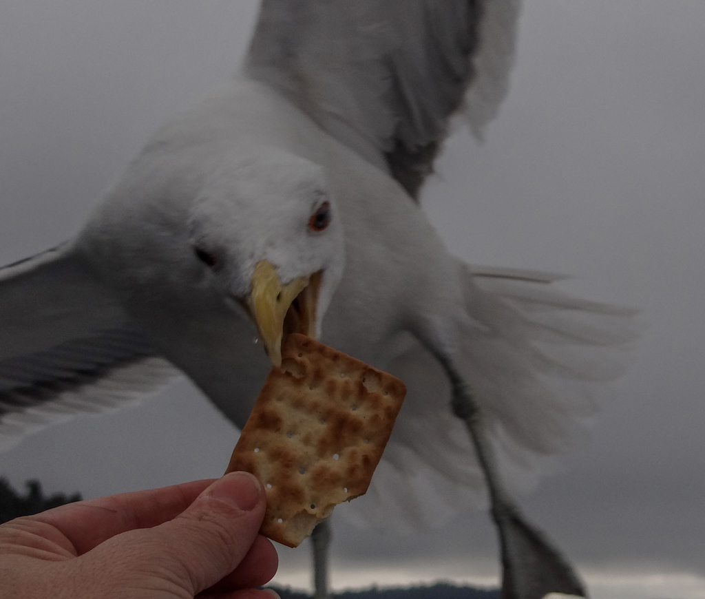 A sea gull went over my head and grabbed a cracker from her hand.