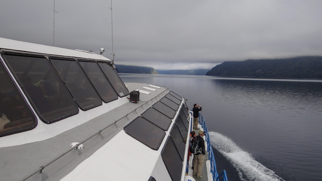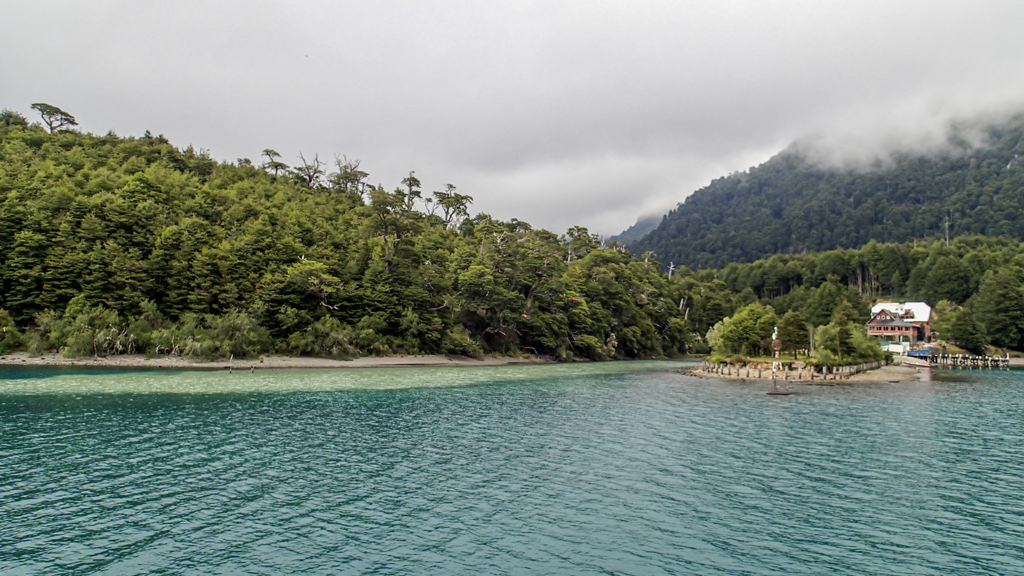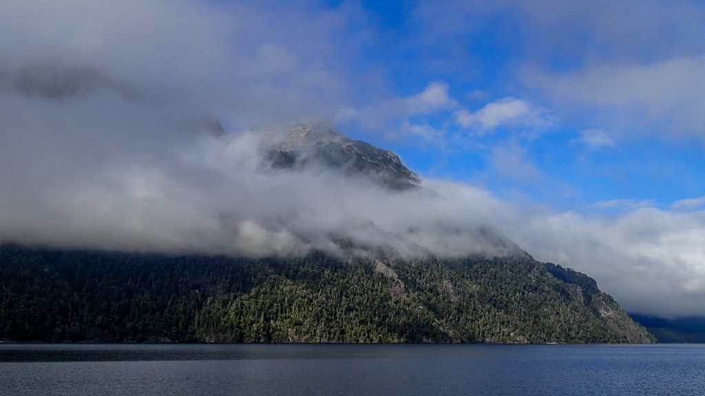 We got aboard the first catamaran for the one hour and ten minute sail to the far side of Lago Nahuel Huapi. The sky was clear over Bariloche but there was fog in the mountains.