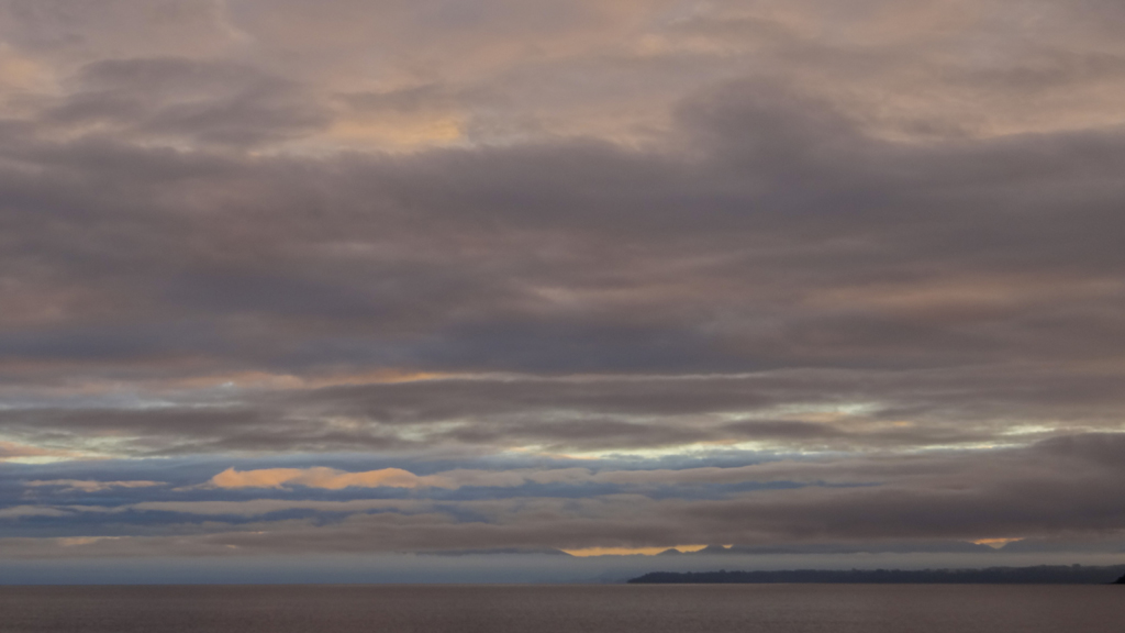 I was up at 6:30 and looked out. No fog! I checked online to see that the sun rose at 7:20, so I got my luggage done and went out to watch the sunrise behind the distant broken cloud. Osorno was hidden behind the clouds, but it was a very peaceful way to start a day.