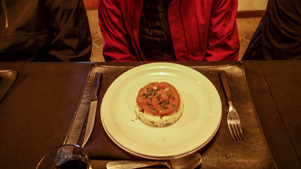 It started with bread, sliced potato, salad and the most delicious sausage. The woman across from me was a gluten free vegetarian and she got a rice cake with a slice of tomato on top.
