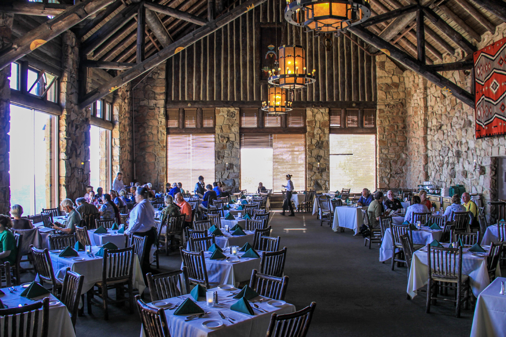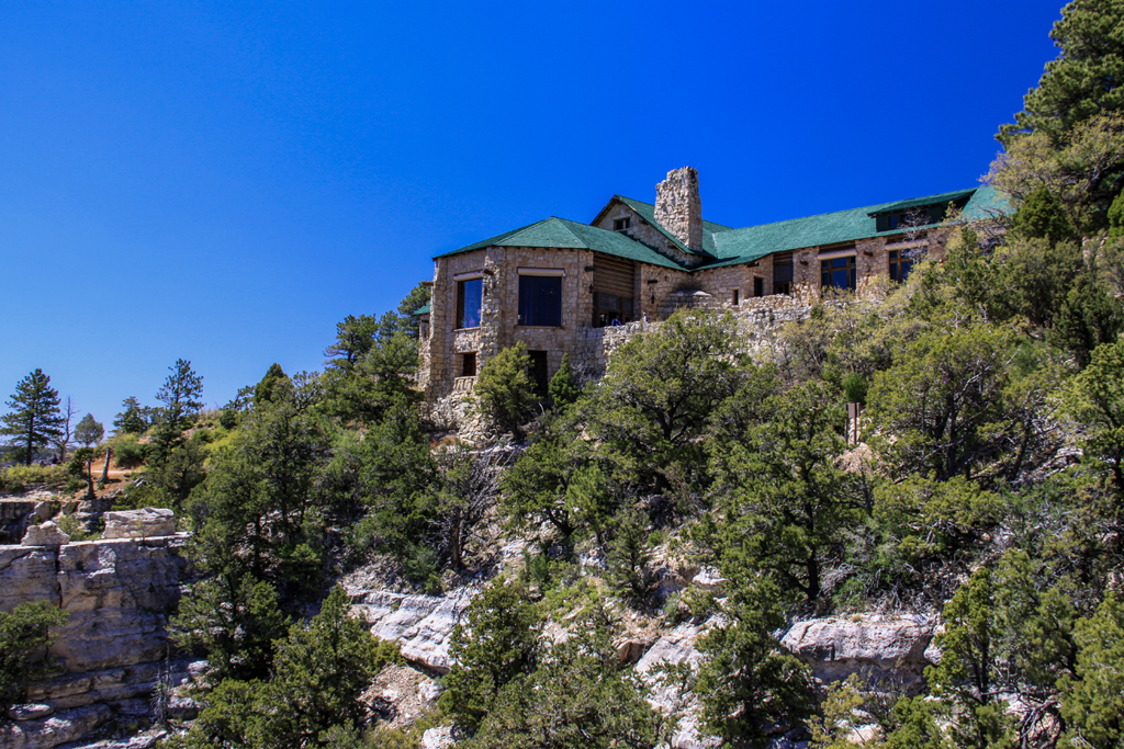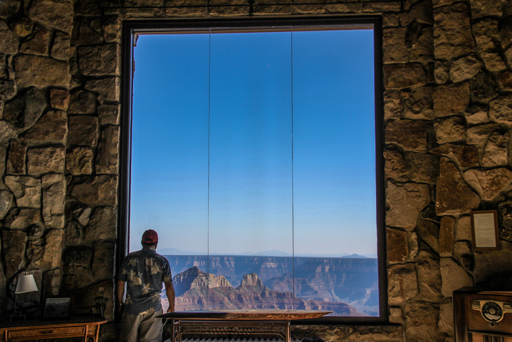 The lodge was originally built in 1928 in a very grand fashion but burned down in 1932 and rebuilt a little less grander. But one grand feature remained – the picture windows that would have given a visitor their first view of the canyon. There were three huge windows arranged in a bay style. With trees lining the road as you arrived at the lodge, this would have been their first view.