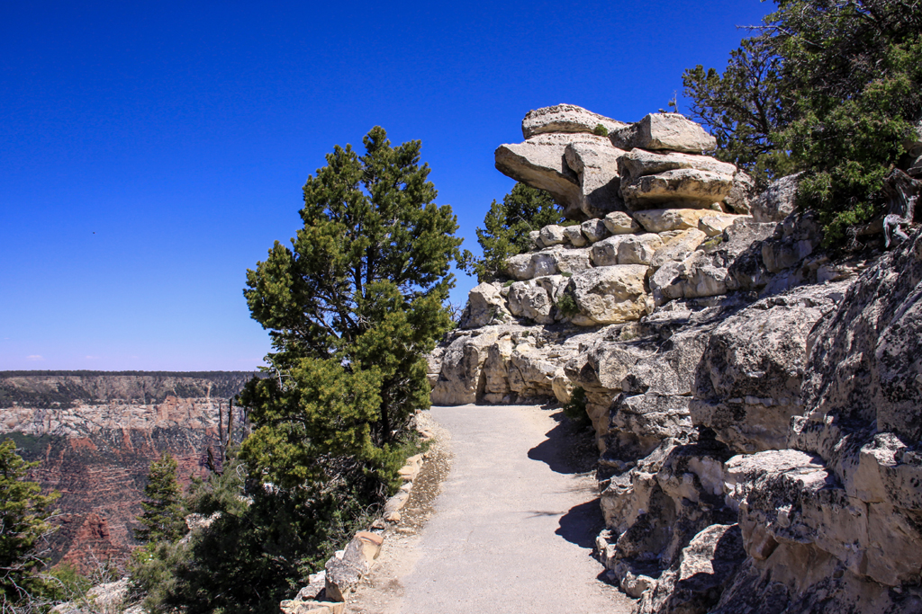 We left Cape Royal and drove for about forty minutes to the North Rim. This was familiar to me. We had the rest of the afternoon free there. Gordon let us loose at two with a drink arranged in the Grand Canyon Lodge at 4:30 and dinner an hour later. We immediately headed towards Bright Angel Point where I could get a good shot of the Grand Canyon Lodge.