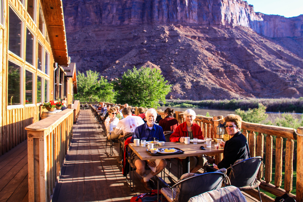 It was about twenty-five minutes through the same gorge to the jet boat company called Canyonlands By Day and Night. We were matched up with a Trafalgar group and started off with dinner. It was the usual tourist mass feeding with salad, corn, cowboy beans, potatoes, chicken and ribs.
